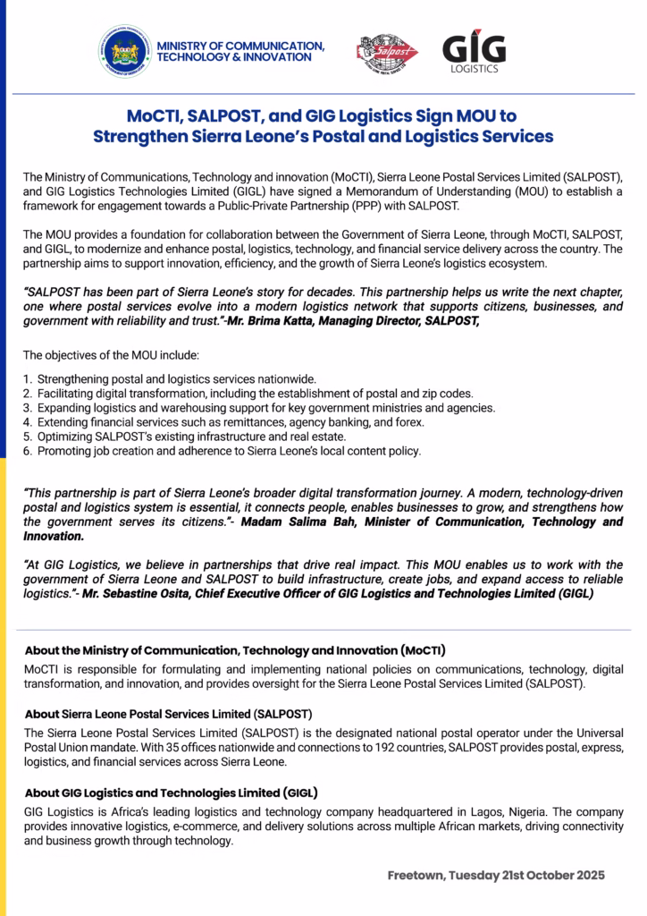 MoCTI, SALPOST & GIGL Partner to Strengthen Sierra Leone’s Postal & Logistics Services